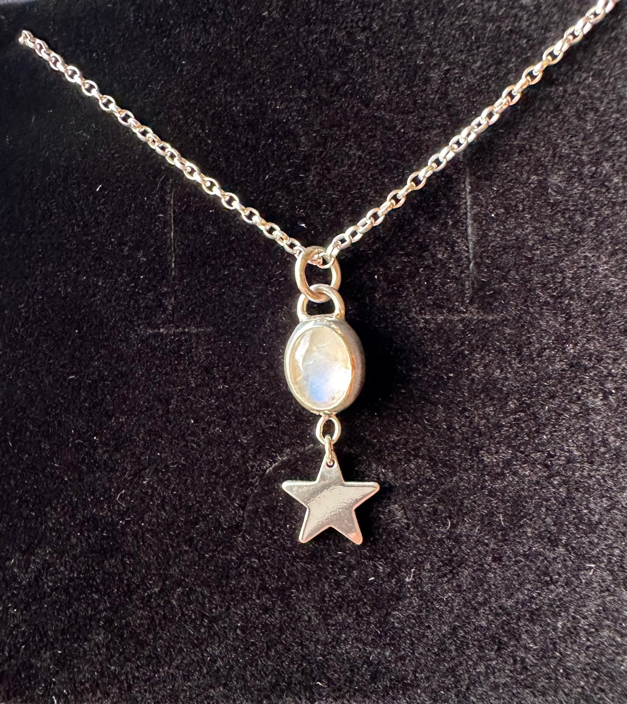 Sterling silver pendant with a very pretty moonstone set. Easy and light to wear and comes on an 18” chain (if you would like to have a different length then please do email me)